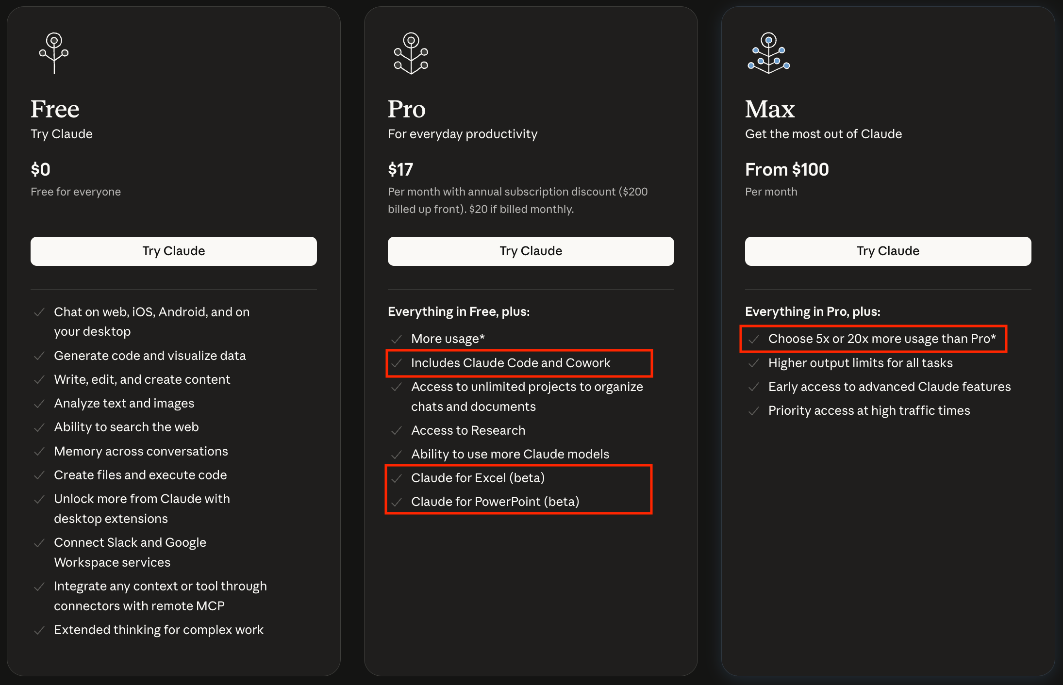 Anthropic’s individual pricing page. Core product differentiators are all in Pro; Max differentiates mainly on its higher usage limit.