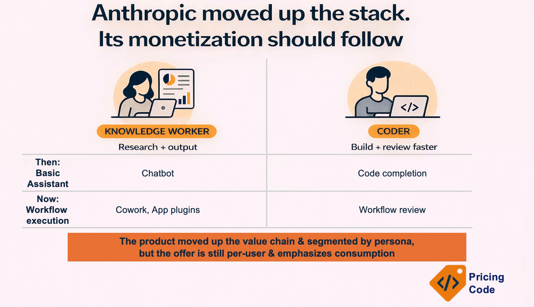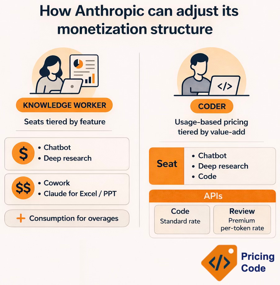 A knowledge-work seat built on unique IP like Cowork and Claude for Copilot, not just token consumption. Cowork, Research, and office tools like Excel and PowerPoint can be tiered into different offerings, giving clear use cases and value. And usage caps that degrade service, rather than shut access off for 5 hours unless you pay for tokens.