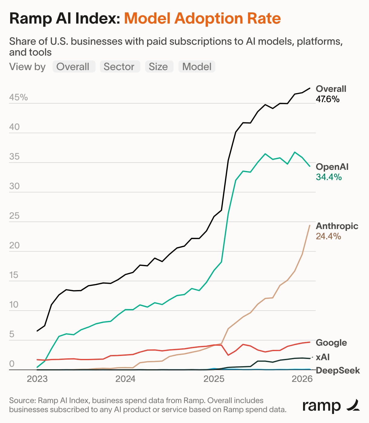 The mismatch is becoming more visible because Claude is increasingly popular on its own merits. Ramp’s March 2026 AI Index says 24% of businesses now pay for Anthropic, up from one in 25 a year ago. Anthropic adoption grew 5% month over month, while OpenAI fell 2%.