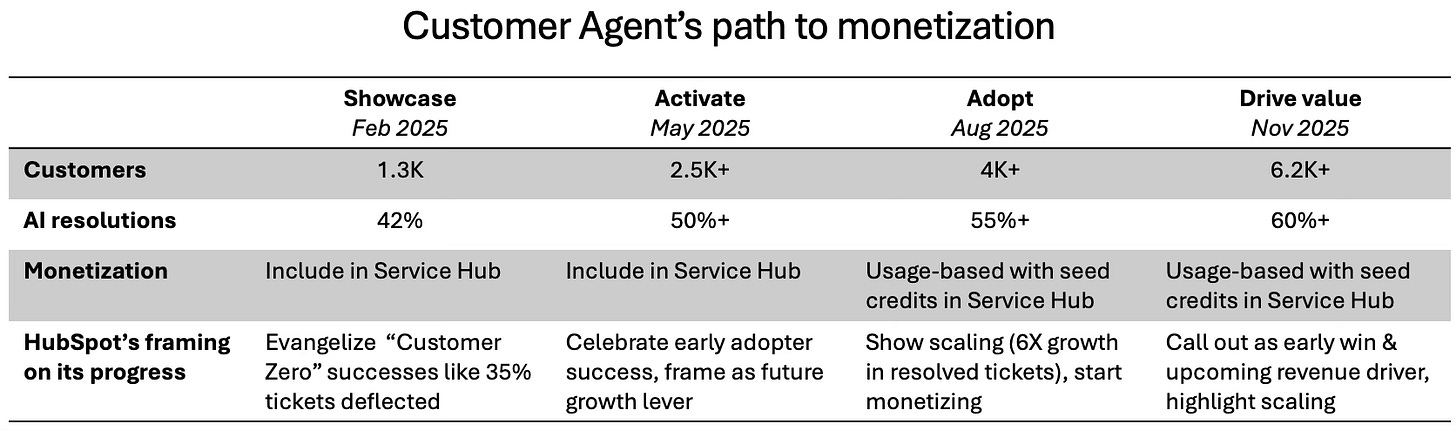 Take Customer Agent. It started as a way for Service Hub customers to deflect tickets and speed up response times. HubSpot moved from discussing its potential to sharing early wins to monetizing. Only after that traction was clear did HubSpot standardize Customer Agent on universal credits and present it as a long‑term growth lever.